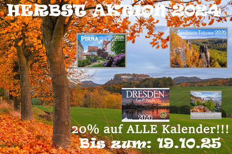 Bei Bestellung meines Großen "Sandstein Träume" Kalenders gibt es einen Tischkalender Eurer Wahl im Wert von 9.00EUR gratis mit dazu. Während des Bestellprozesses einfach im Feld "Anmerkungen zur Bestellung" den Kalender den Ihr zusätzlich mit haben möchtet (Sächs. Schweiz oder Dresden) mit angeben.